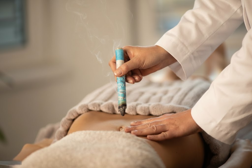 Terapia que aplica calor en los puntos de acupuntura utilizando la hierba "moxa" para mejorar la circulación y aliviar el dolor.